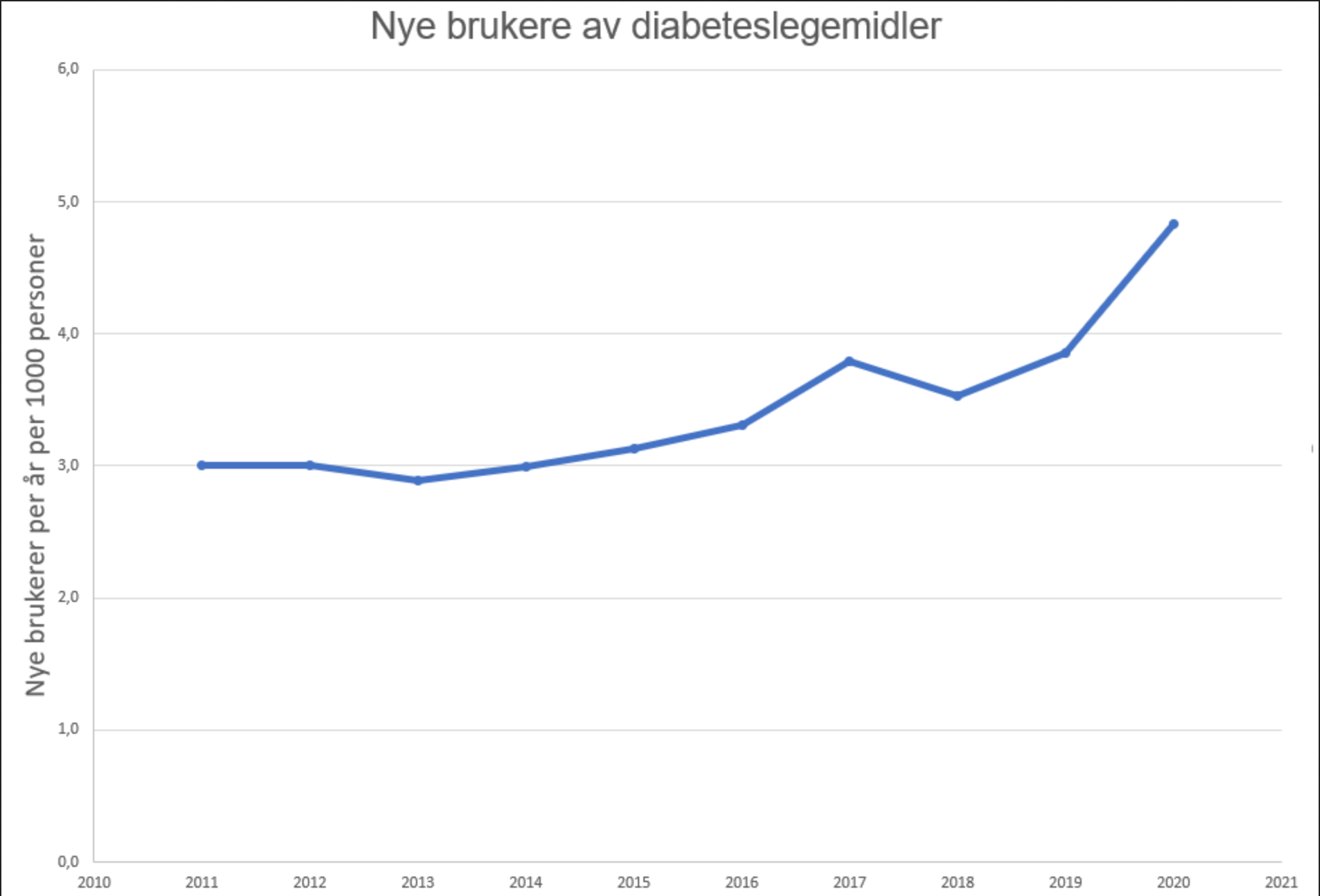 Antall nye brukere av diabeteslegemidler øker kraftig ifølge en helt fersk rapport fra Folkehelseinstituttet. Vi har sett en gradvis økning de siste fem årene, men ser at økningen har gjort et hopp i 2020.