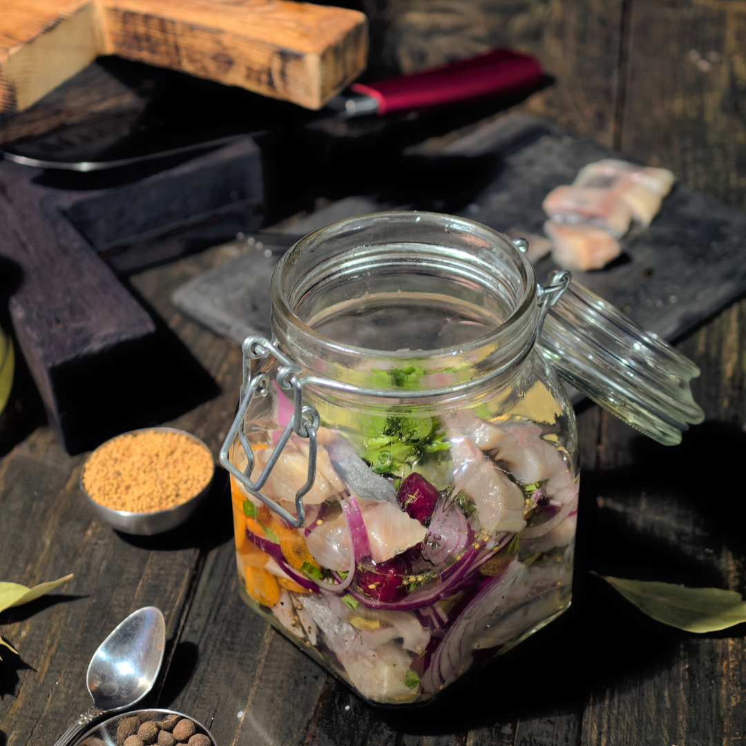 Varva sill, granskott, enbär, gurka, silverlök. Häll över lagen och låt stå i minst 24 timmar.