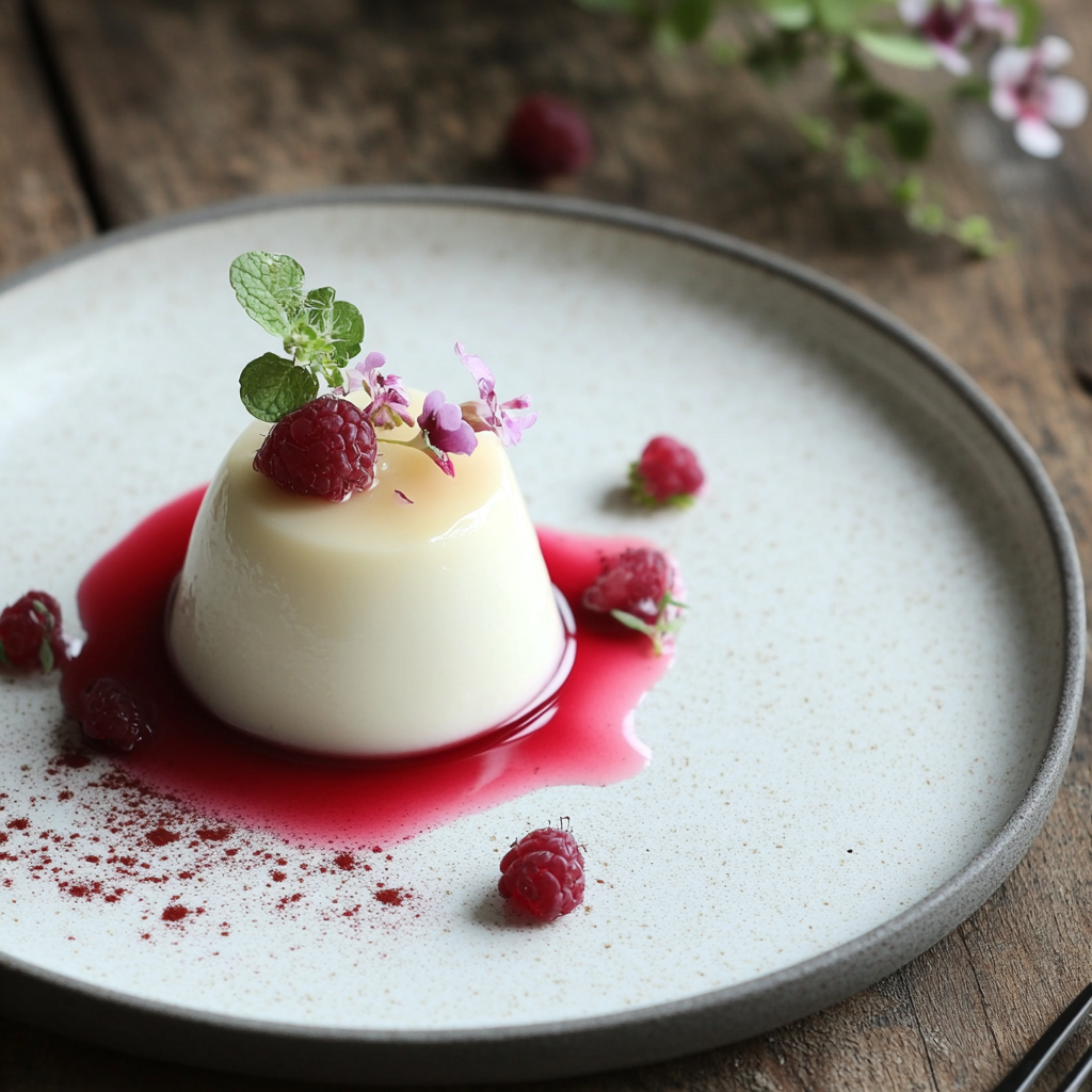 Koka upp grädde, saffran, vaniljpulver och sötning. Lägg gelatinbladet i kallt vatten, krama ur och smält i den varma gräddblandningen. Häll upp i små glas och låt stelna i kylskåp. Toppa med färska hallon innan servering.