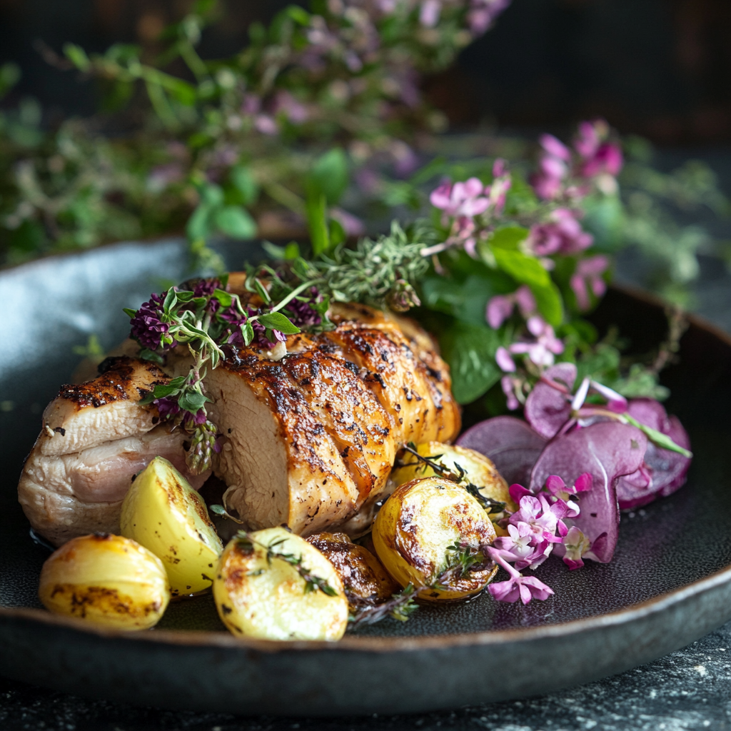 Kalkonfilé eller kycklingfilé, kryddad med salt, peppar, timjan och apelsinzest.